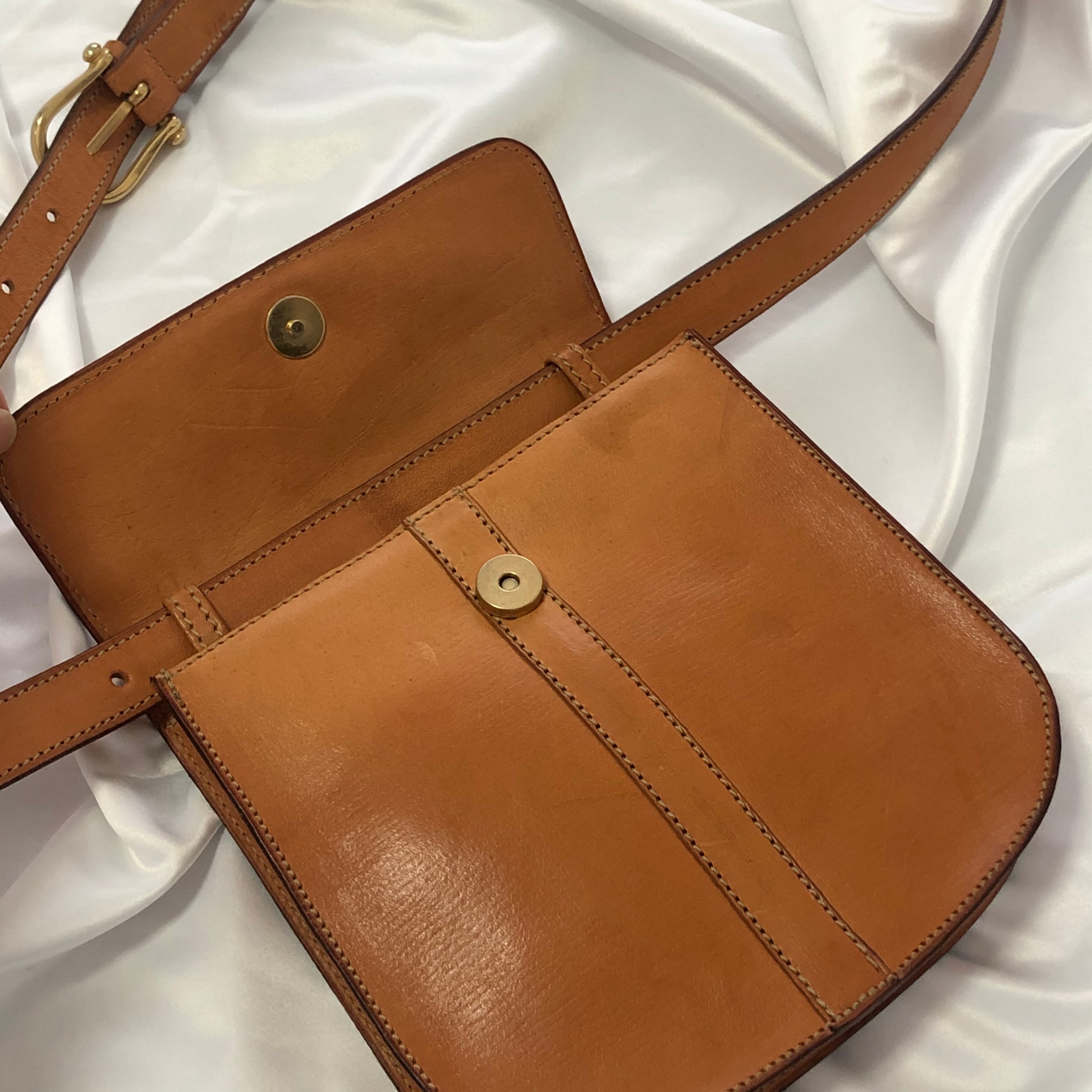 ヌメ革ですので経年によるシミはございますがビンテージ感を感じられるバッグです。